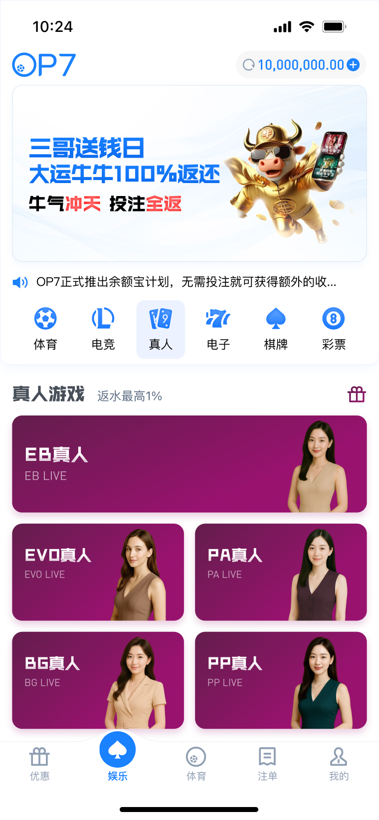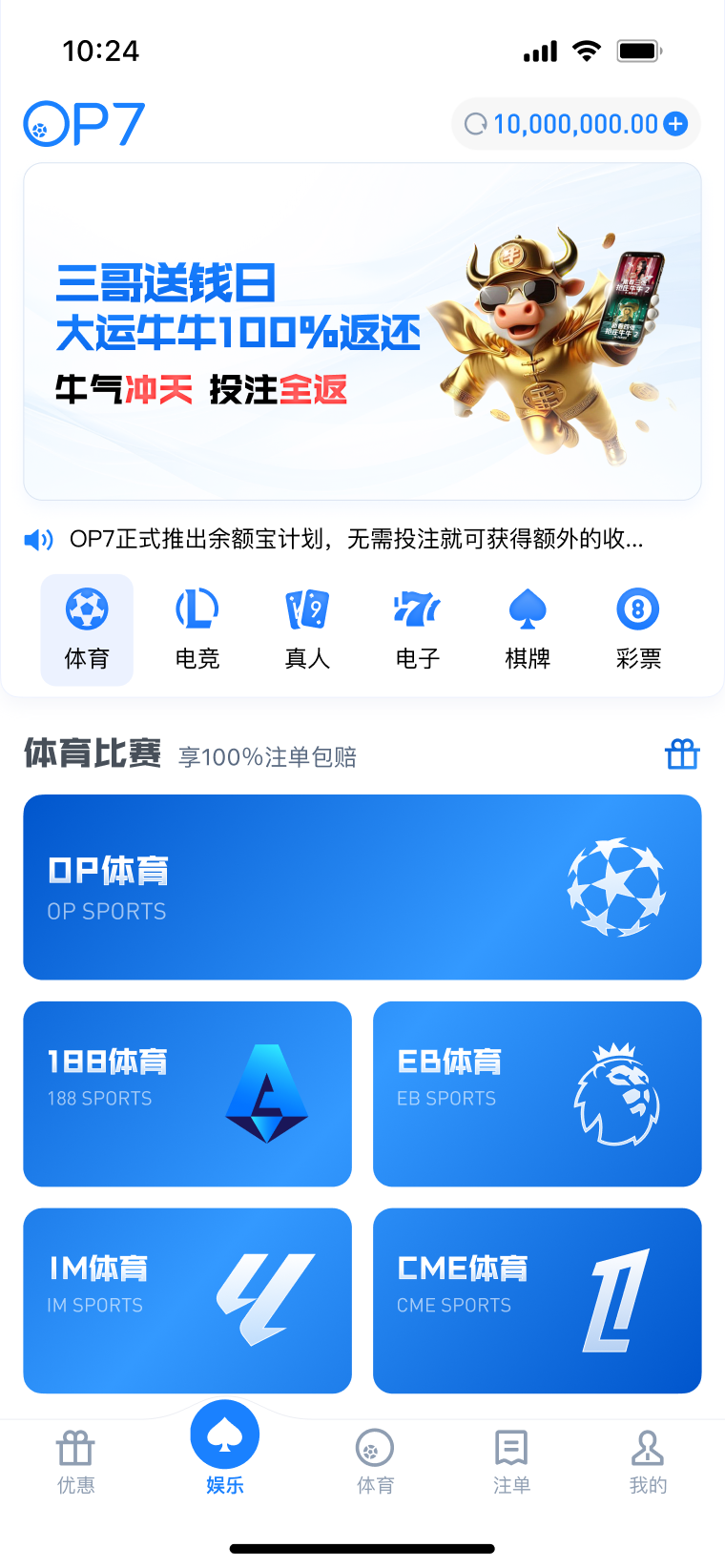 每周于【OP体育】【CME体育】【EB体育】场馆投注指定赛事,享指定场馆总负盈利包赔!本活动无需申请,赛事结束12小时后自动结算包赔彩金。详情请查看官网活动页面。